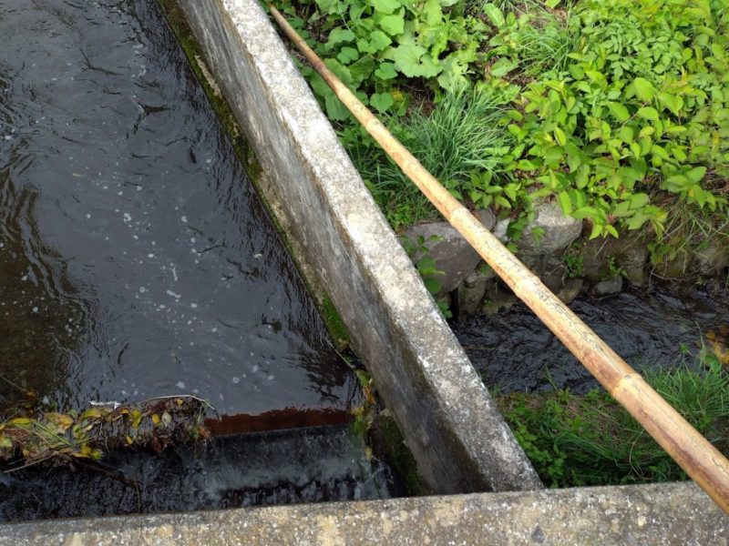 思ったより道路よりずいぶん下の方に取り入れ口があったので、どうやって掃除するのかと思ったら、ながーい竹の棒が置いてあって、これで枯葉や枯枝を「えいっ!えいっ!」と押したり突いたりして水路に流すみたい。