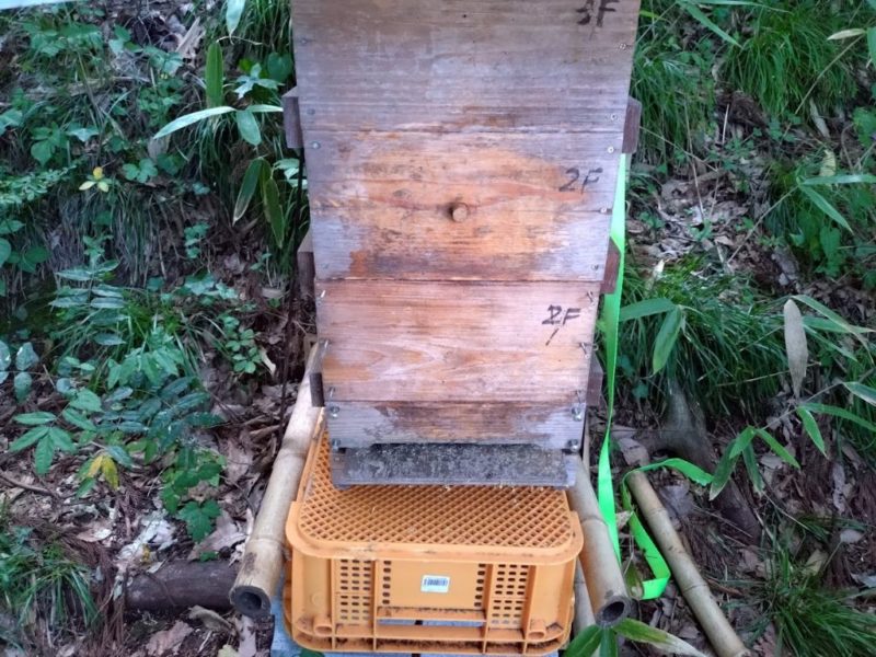 午前中に草刈りや畑仕事を終えて、ハチさんの様子を見に行くと、なんと先に住んでくれた方の4階建ての巣箱がもぬけの殻になっていました。