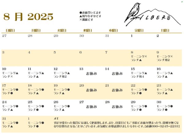 2025年8月7日 2025年8月7日 HSHMアルベロ つれづれ 8月8日のモーニングはお休みです。 白州アルベロです。8月8日のモーニングは、所用により臨時休業です。ランチタイムの11時30分からの営業となります。宜しくお願い致します。 共有: Facebook で共有するにはクリックしてください (新しいウィンドウで開きます) Facebook クリックして X で共有 (新しいウィンドウで開きます) X いいね:いいね 読み込み中…Bluesky