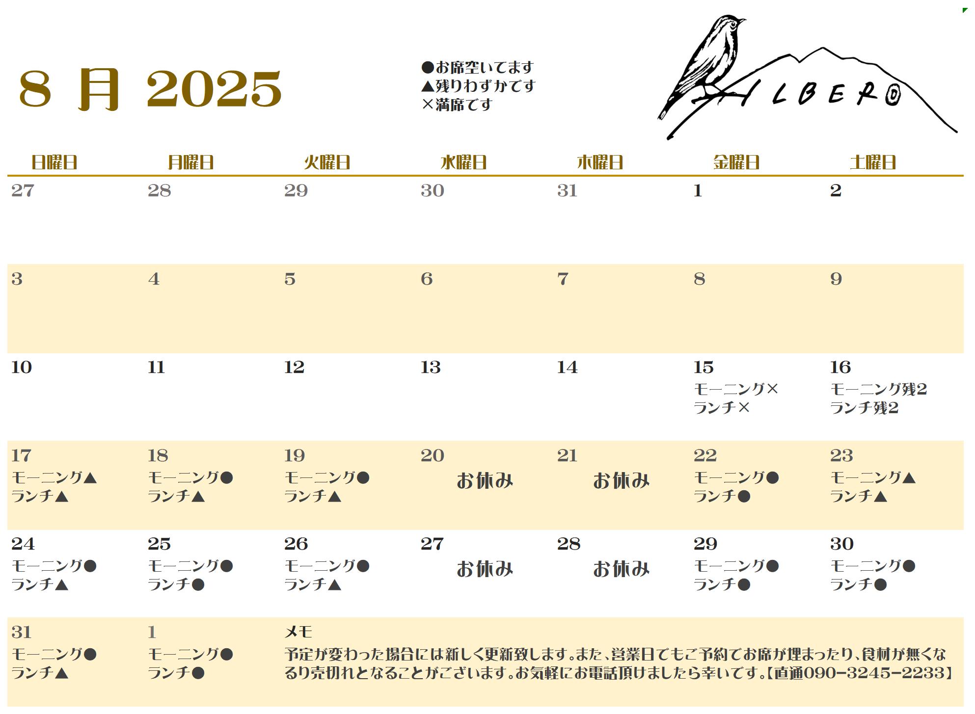 明日8月15日(金)はモーニング・ランチとも満席となっております。