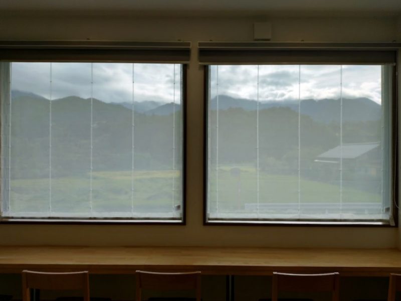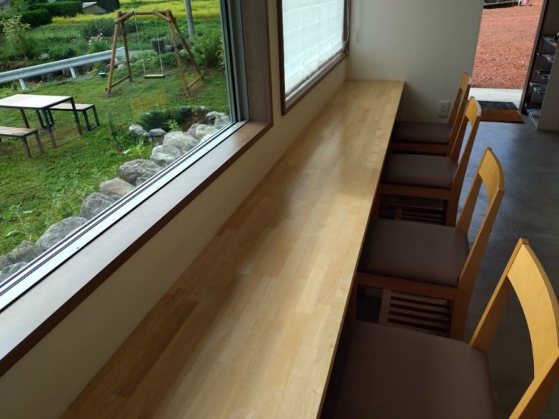 昨年の秋から予想以上に、強い日差しが東側の窓と、カウンター席の窓から差し込みまして、特にカウンター席では度々ロールスクリーンを下げないと眩しすぎることがありましたので、東側の窓にはホームセンターで買ってきた日よけを取り付け、カウンター席にはレースのシェードを付けて頂きました。