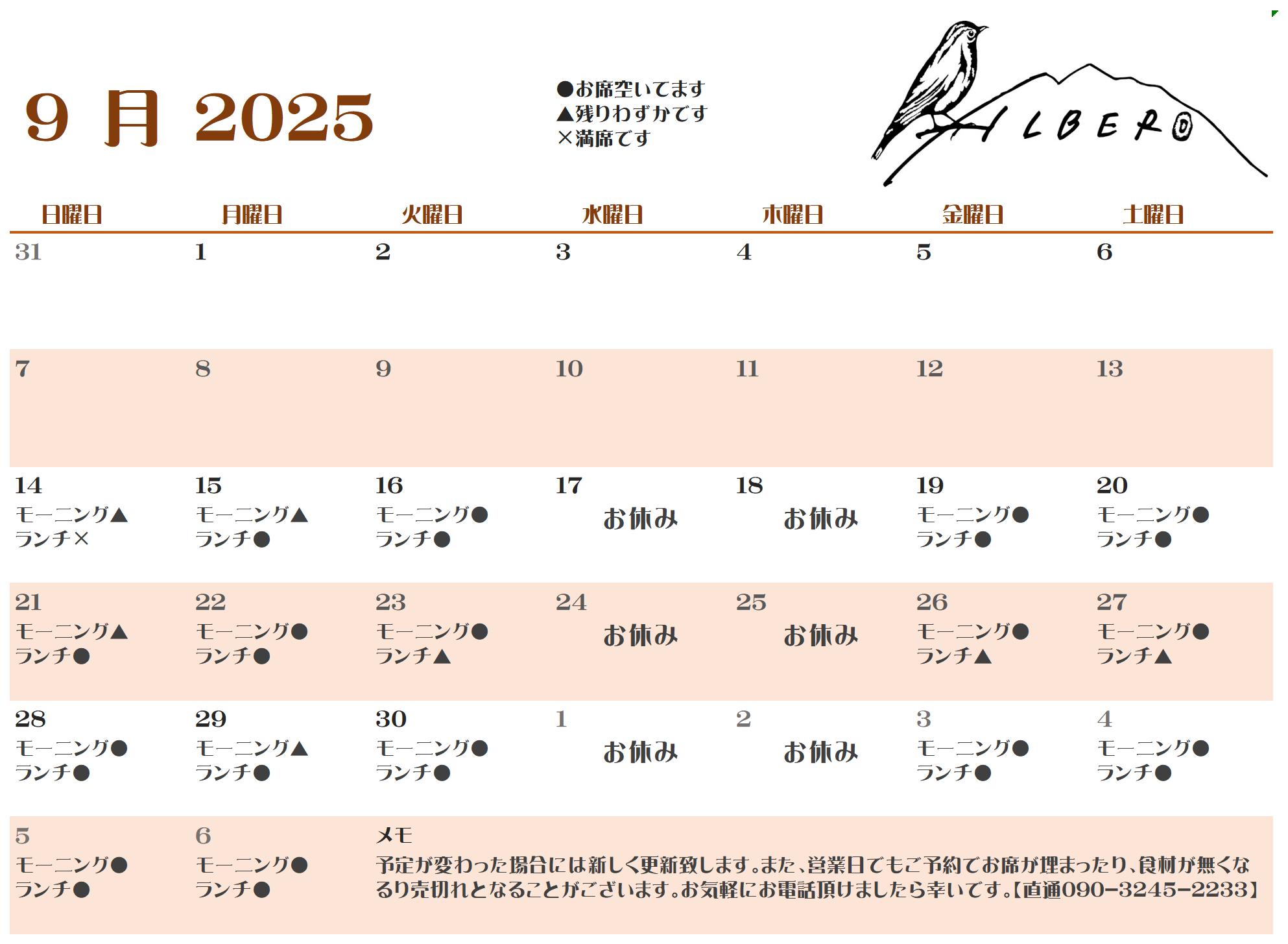 本日9月14日(日)のランチタイムはご予約で満席となっております。