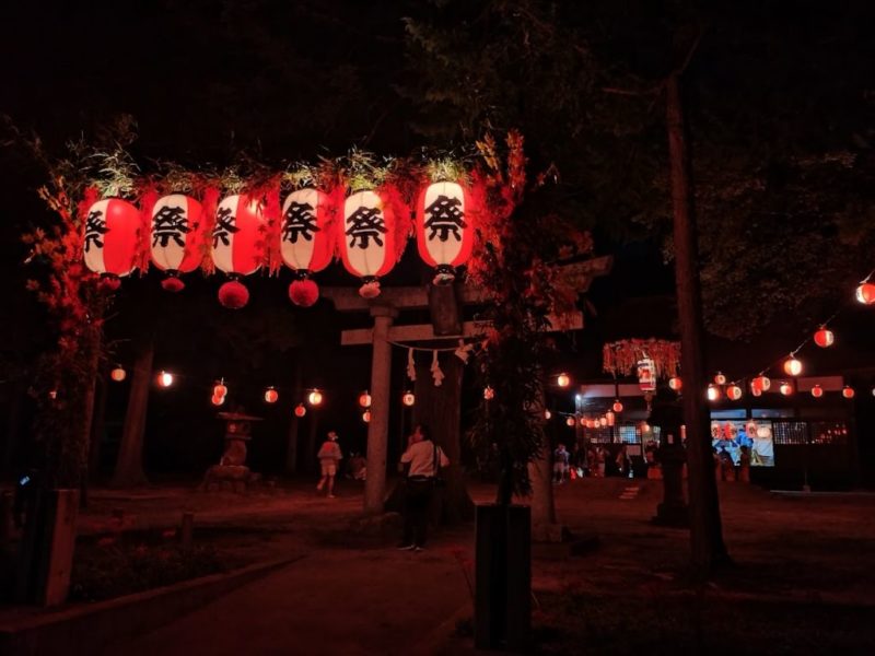 神社には人がいて、提灯が飾られていてとても綺麗。