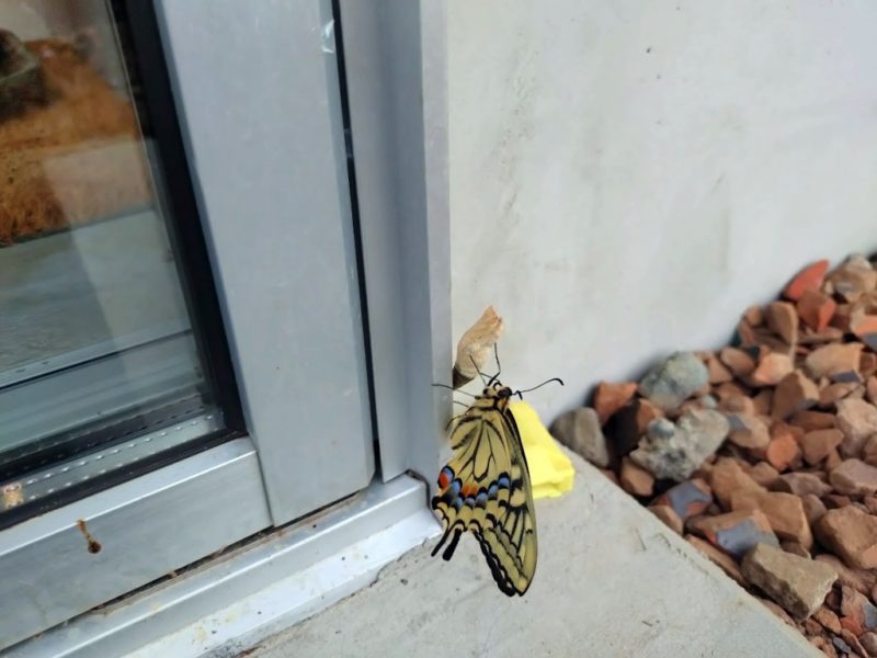 ドア枠で蛹になってしまったキアゲハで、大丈夫かなぁと心配しておりましたが、本日無事に羽化して飛び立って行きました。