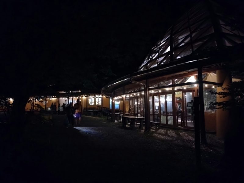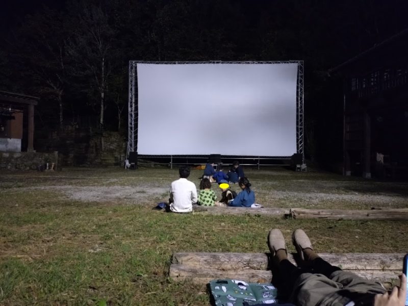 正面の管理棟で代金を払って、暗い森の中を懐中電灯の灯りを頼りに歩くと、大きなスクリーンが張られた会場に着きます。