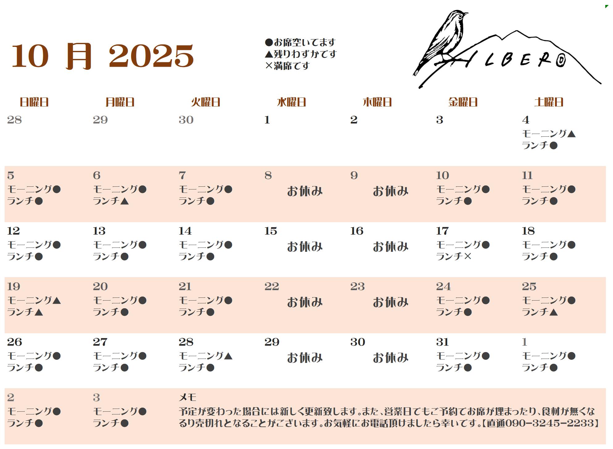 明日10月4日㈯のモーニングは、現在残り3名様で満席となります。