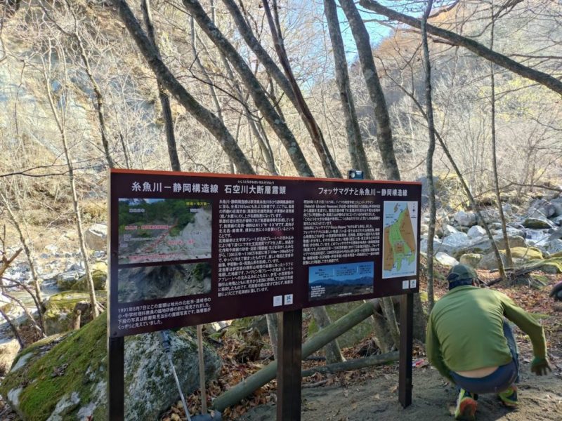 渓谷駐車場の注意書き看板とフォッサマグナの真ん前の説明看板の設置です。