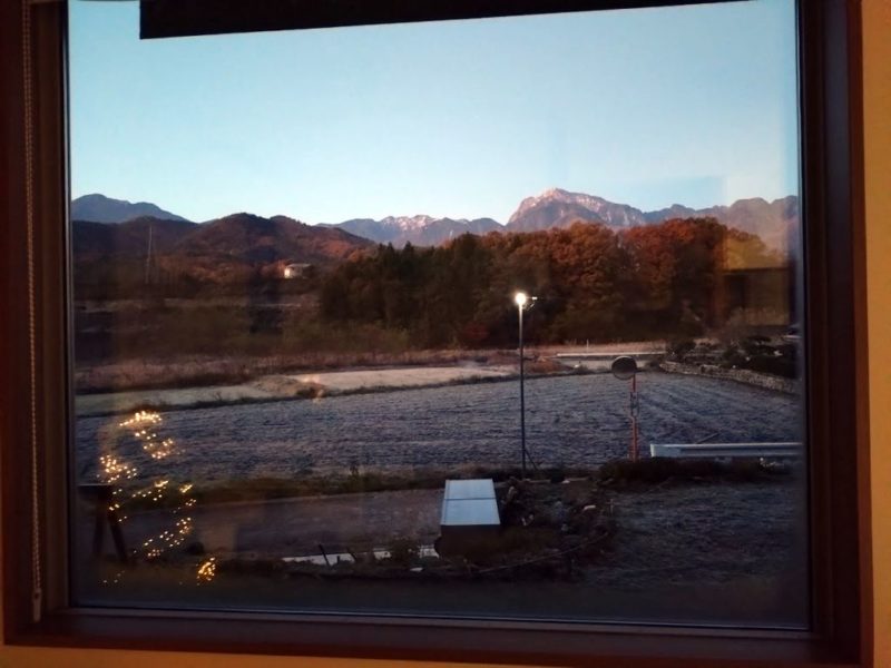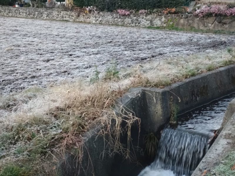 田んぼに霜が降りて真っ白です。