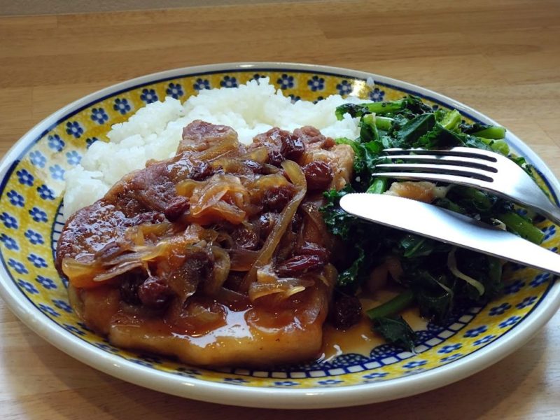 今日のお昼のまかないは以前の宿屋でお出ししていた、梅酒とレーズンを使った人気メニューのフルーティ酢豚味のポークソテー。