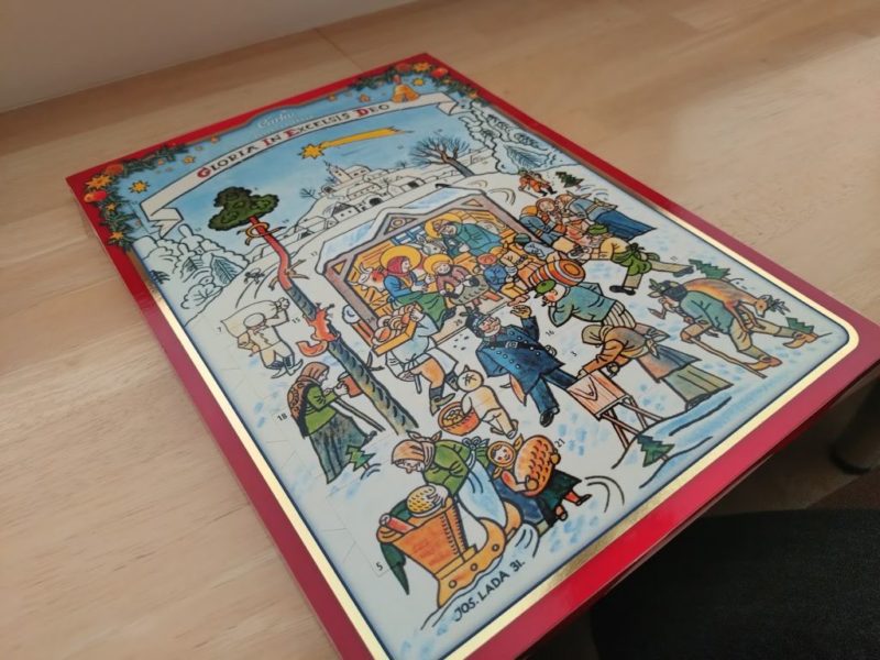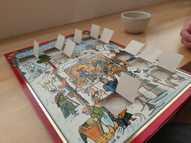 12月1日から24日迄数字がふってあって、数字のマスをめくるとコイン型のチョコが出てくるやつ。
