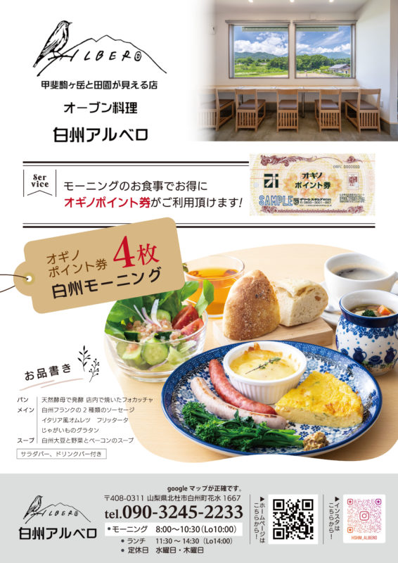 山梨県・長野県にお住いのお客様には馴染みのある、スーパーオギノさんのポイント券で、白州アルベロのモーニングを召し上がっていただくことが出来るようになりました。