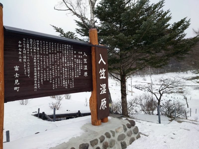 登山道はすぐに雪が出て来て、そこからはひたすら雪道を登り続けると、徐々に雪は深くなるものの、ズボッとなる程の深さにはならず、入笠湿原の上に到着。