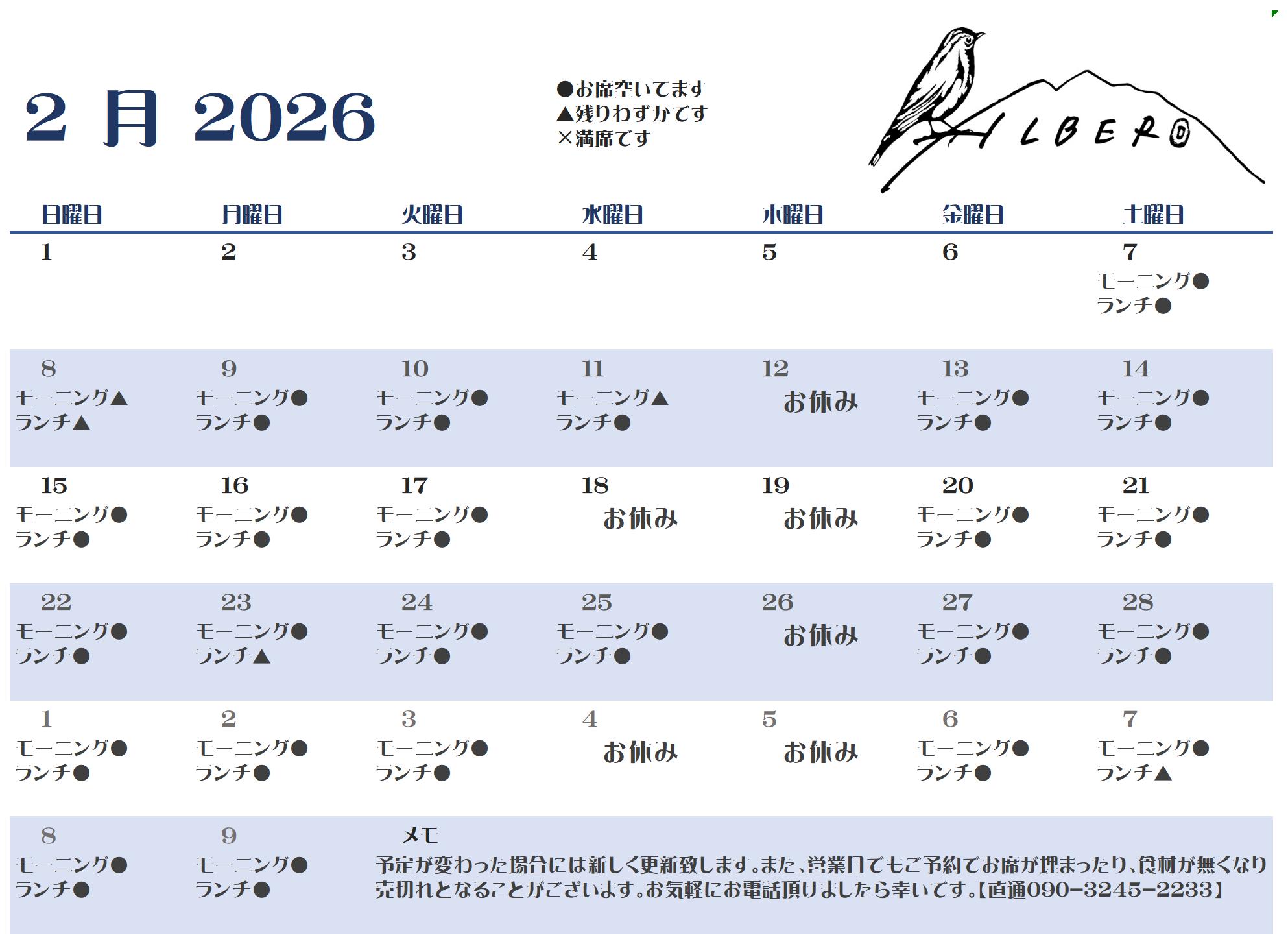 お席に空きが出ましたのでカレンダーを更新させて頂きます。