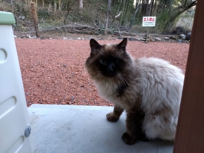 ウチの野良猫ポンさんは、夕べは避難小屋で寝ていたみたいで、ドアを開けたら迷惑そうな顔で小屋から出て来ました。