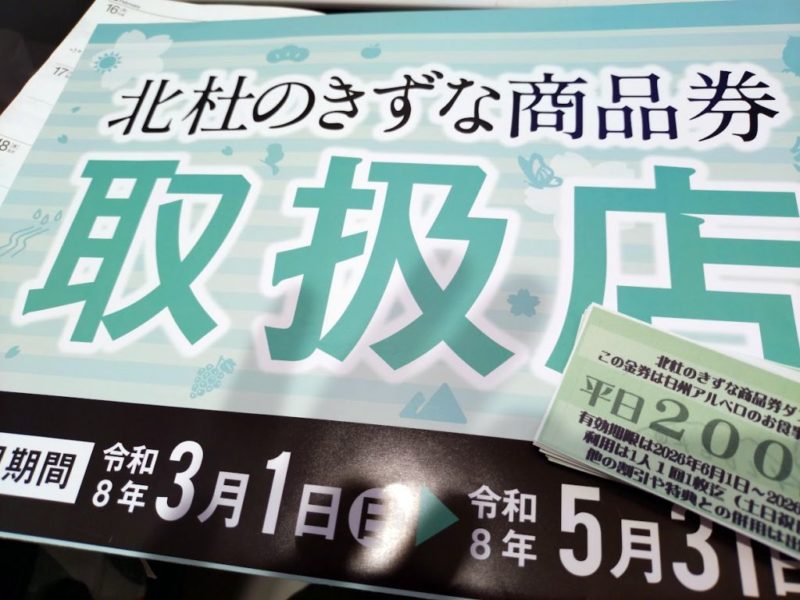 地元事業者のところで使える券地元券と、チェーン店なんかでも使える全店共通券の2種類がございますが、白州アルベロでは両方利用可能です。