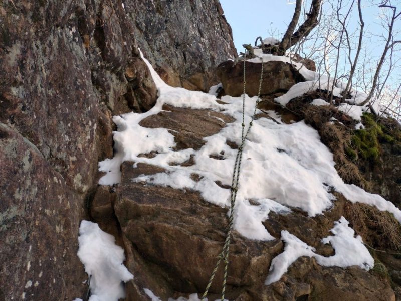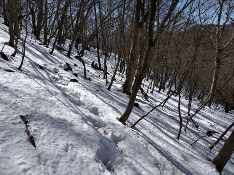 ラスボスの曲岳は登りはまだしも、観音峠への下りの北側斜面は雪や氷が残っていて、岩場を越えるのが大変でした。